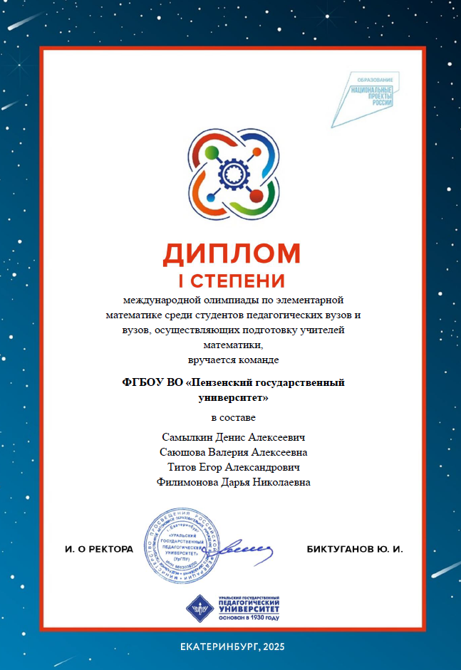 Эти состязания являются командными соревнованиями, проходят онлайн в дистанционном формате и предназачены для студентов - будущих учителей математики. Два дня в течение трех часов наши ребята решали олимпиадные задания. В результате были показаны блестящие результаты: команда группы 23ФПМ1 (Блинова Юлия, Бочкина Полина, Тюрина Анна, Юртайкина Мария) была удостоена диплома 1 степени по высшей математике и диплома 3 степени по элементарной математике; команда группы 24ФПМ1 (Саюшова Валерия, Титов Егор, Филимонова Дарья, Самылкин Денис) была удостоена диплома 1 степени по элементарной математике и диплома 3 степени по высшей математике.