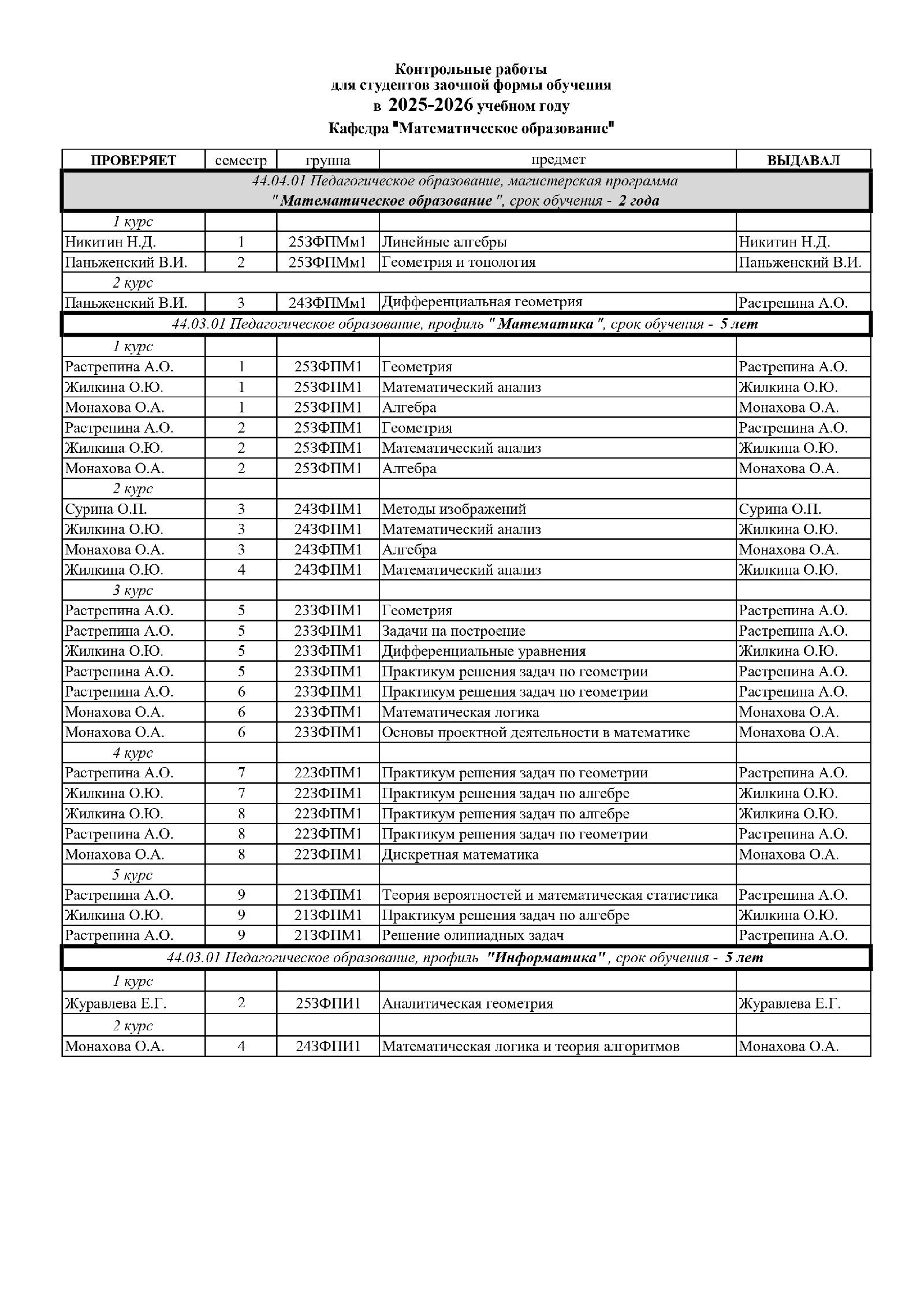 Выполненные контрольные работы необходимо предоставить для проверки на кафедру "Математическое образование", расположенную по адресу: 440026, г. Пенза, ул. Лермонтова, д.37, учебный корпус №13, 3-й этаж, аудитория 13-34. Свои работы необходимо предоставить не позднее недели от начала сессии.